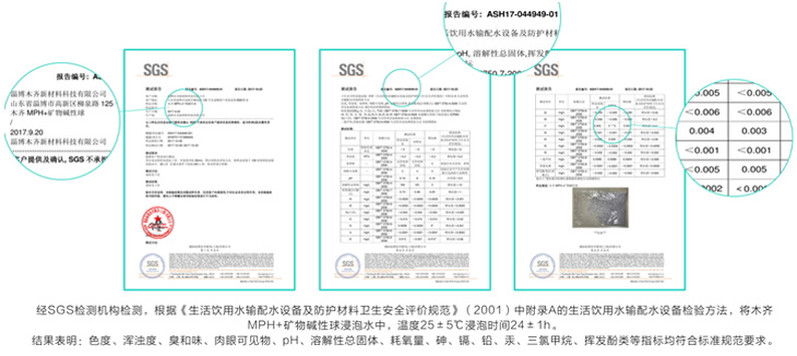 表1MPH中和球与常规中和材料性能对比表 3.1 长效性优势 根据木齐科技提供的动态滤芯测试数据:在模拟家用场景下,将MPH中和球填充于T33滤芯,以0.26L/min的流速通入纯水。在连续通过1200升水后,出水pH值仍稳定在8.5左右。这一数据充分证明了其超凡的耐久性,寿命是普通碳酸钙材料的5倍以上。对于燃气热水器而言,这意味着用户可能一年仅需更换一次中和芯,极大地提升了用户体验并降低了售后维护成本。 3.2 安全性与环保性认证 作为直接或间接接触水体的材料,安全性是首要考量。MPH中和球在此方面具备了权威的“双保险”: (1)SGS饮用水安全检测:依据国家《生活饮用水输配水设备及防护材料卫生安全评价规范》,对其浸泡液进行检测,色度、浑浊度、臭和味、耗氧量、重金属(砷、镉、铅、汞)等19项指标全部合格。这意味着即使中和球意外接触饮用水,也是绝对安全的。 (2)欧盟RoHS认证:该认证证明MPH中和球未检出铅、汞、镉、六价铬、多溴联苯等十大有害物质,满足全球最严格的环保指令之一。这不仅是对产品环保性的背书,也为贵司热水器出口至欧美市场扫清了潜在障碍。 3.3 物理稳定性 其高达800kgf的抗压强度和高温烧结工艺,确保了它在长期水流冲击和环境温变下,能保持形态完整,从根本上解决了传统材料“粉化堵塞排水管”这一顽疾。
