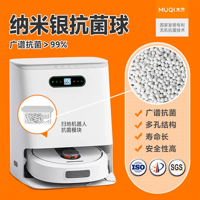 一、智能清洁时代的健康隐忧与技术需求 扫地机器人作为智能家居生态的关键一环,正经历着从“扫得干净”到“扫得健康”的消费升级。用户不仅关注其导航能力、吸力大小,更日益重视其本身的卫生状况及其对室内环境质量的潜在影响。研究表明,扫地机器人在完成清洁任务后,其内部组件,特别是尘盒、湿拖水箱、HEPA滤网及气流通道,因残留水分、灰尘、皮屑等有机营养物质,且长期处于密闭或半密闭状态,极易成为微生物(如大肠杆菌、金黄色葡萄球菌、黑曲霉、青霉等)滋生的“温床”。 这些微生物代谢产生的异味、菌膜以及可能随排风扬起的菌孢,不仅会腐蚀机器内部元件,缩短产品寿命,更可能导致清扫后的室内空气质量反而下降,甚至引发过敏、哮喘等健康问题。因此,如何从设计源头抑制扫地机器人内部的微生物滋生,已成为行业亟待解决的核心痛点。 传统的解决方案如定期手工清洗、使用化学消毒剂喷洒等,存在操作繁琐、效果短暂、可能腐蚀机器或造成化学残留等弊端。在此背景下,一种高效、长效、安全且可集成于设备内部的无机抗菌技术——纳米银抗菌球,应运而生。本文将深度剖析该材料的技术内核,并重点阐述其在扫地机器人这一特定应用场景中的价值与实践路径。 二、纳米银抗菌球的技术内核:机理、工艺与性能优势 纳米银抗菌球并非简单的物理混合材料,而是一种通过先进的材料设计与陶瓷成型工艺制备而成的复合功能材料。 2.1 核心技术原理与制备工艺 其技术核心在于“载体”与“固载工艺”。木齐新材选用具有丰富多孔结构的硅藻土、沸石等环境矿物作为载体,通过专利低温固化陶瓷成型技术(如ZL202210958043.5),将纳米尺度的银离子或银簇牢固地“锚定”在矿物基体的晶格与微孔中。这一工艺确保了银元素以稳定的固溶体形式存在,而非简单附着,从而实现了银离子的可控、缓慢释放,而非快速溶出。 2.2 多重抗菌机理 银离子的抗菌作用是多重机制协同的结果,使其具备广谱、高效且不易产生耐药性的特点,银离子抗菌机理主要有以下几种: 1. 破坏细胞膜:带正电的Ag⁺与带负电的细菌细胞膜发生静电吸附,破坏其通透性与完整性,导致细胞内容物泄漏。 2. 抑制酶活性:Ag⁺与细菌呼吸链关键酶(如含巯基的酶)结合,使其失活,中断能量代谢,致使细菌“窒息”死亡。 3. 干扰遗传物质:Ag⁺能渗透入细胞核,与DNA碱基结合,扰乱DNA复制与转录,有效阻止细菌繁殖。 4. 诱导氧化应激:纳米银可催化产生活性氧(ROS),引起细菌内部氧化损伤,加速其死亡。 2.3 性能优势凸显 基于上述机理与工艺,纳米银抗菌球展现出如下突出优势: 1、长效性:银离子缓释技术确保其在数月内持续有效,无需频繁更换或添加。 2、安全性:银离子释放浓度极低(通常为ppb级),远低于世界卫生组织(WHO)规定的饮用水安全标准(0.1 mg/L),对人体、宠物及环境友好,无化学残留风险。 3、稳定性:无机陶瓷基体耐高温、耐冲刷,物理化学性质稳定,适用于扫地机器人内部复杂工况。 4、广谱性:对细菌、霉菌、真菌等均有显著抑制效果,抗菌率普遍超过99.9%。 三、扫地机器人微生物污染深度剖析与纳米银解决方案 3.1 污染热点与危害分析 1、尘盒:聚集了灰尘、毛发、有机物,结合空气中凝结的水分,是细菌和霉菌繁殖的首要区域。 2、湿拖水箱与抹布:静止的存水为微生物提供了理想的液体培养基,若不加以抑制,拖地过程等于用菌液擦拭地板。 3、HEPA滤网与风道:潮湿的滤网是菌膜形成的重灾区,不仅降低过滤效率,产生的异味和孢子还会随排风扩散至全屋。 4、滚刷与边刷:直接接触地面污物,难以彻底干燥,易成为致病菌的携带者。 这些污染不仅直接影响机器性能(如风道堵塞导致吸力下降,传感器误判),更深层次的是对家庭健康环境构成威胁。 3.2 纳米银抗菌球的集成应用方案 针对上述痛点,可设计多种集成方案: 1.水箱专用抗菌模块:将木齐新材的蓝色缓释型抗菌球封装于专用塑料网盒,置于清水箱进水口或内部。水流经过时激活银离子释放,确保拖地用水始终洁净,从源头防止霉变和异味产生。根据水箱容积(通常1-3升),投加8-10克抗菌球即可满足长效抑菌需求。 2.尘盒抗菌组件:在尘盒内壁设计抗菌球卡槽,或开发含纳米银涂层的抑菌尘袋。银离子可直接作用于聚集的垃圾,抑制微生物活动,减少异味产生。 3.风道/滤网抗菌优化:在风道入口或HEPA滤网支架处设置小型抗菌模块,对进入风道的空气进行初步净化,抑制滤网表面菌膜形成。亦可开发复合纳米银材料的抗菌滤网。 4.一体化抗菌设计:对于高端机型,可在底盘、滚刷舱等易积水部位考虑集成抗菌材料,实现全方位的微生物防护。 表纳米银抗菌球方案与传统抑菌方式对比
